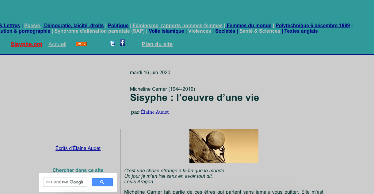 Je l’ai déjà écrit, ici, il y a un an (1), Micheline a créé le site Sisyphe en juin 2002, et m’a invitée à la rejoindre à l’automne de la même année. Ce site encyclopédique est devenu l’œuvre de sa vie. Elle a choisi le nom Sisyphe, parce qu’il est un symbole à la fois de liberté, de détermination, et de vigilance pour les femmes qui doivent toujours recommencer à faire valoir leur droit à l’existence et à la parole.