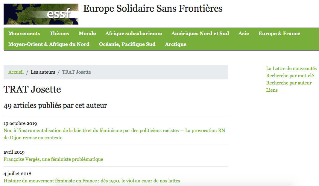 Ce féminisme universaliste n’a rien à voir avec celui d’un certain nombre d’intellectuelles, proches des gouvernements dits de gauche qui, au fil des années, ont trahi leurs promesses : développement des politiques néolibérales sur le plan économique et social, renoncement au droit de vote des étrangers, mise en cause des libertés publiques au nom de la lutte contre le terrorisme, notamment depuis 2001, soutien aux gouvernements corrompus et répressifs de nombreux pays africains, stigmatisation des personnes musulmanes soupçonnées de connivence avec les djihadistes [28] etc. Or F. Vergès n’opère aucune distinction pourtant essentielle si l’on veut débattre sur le fond.